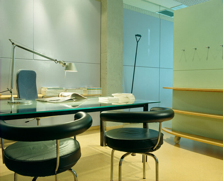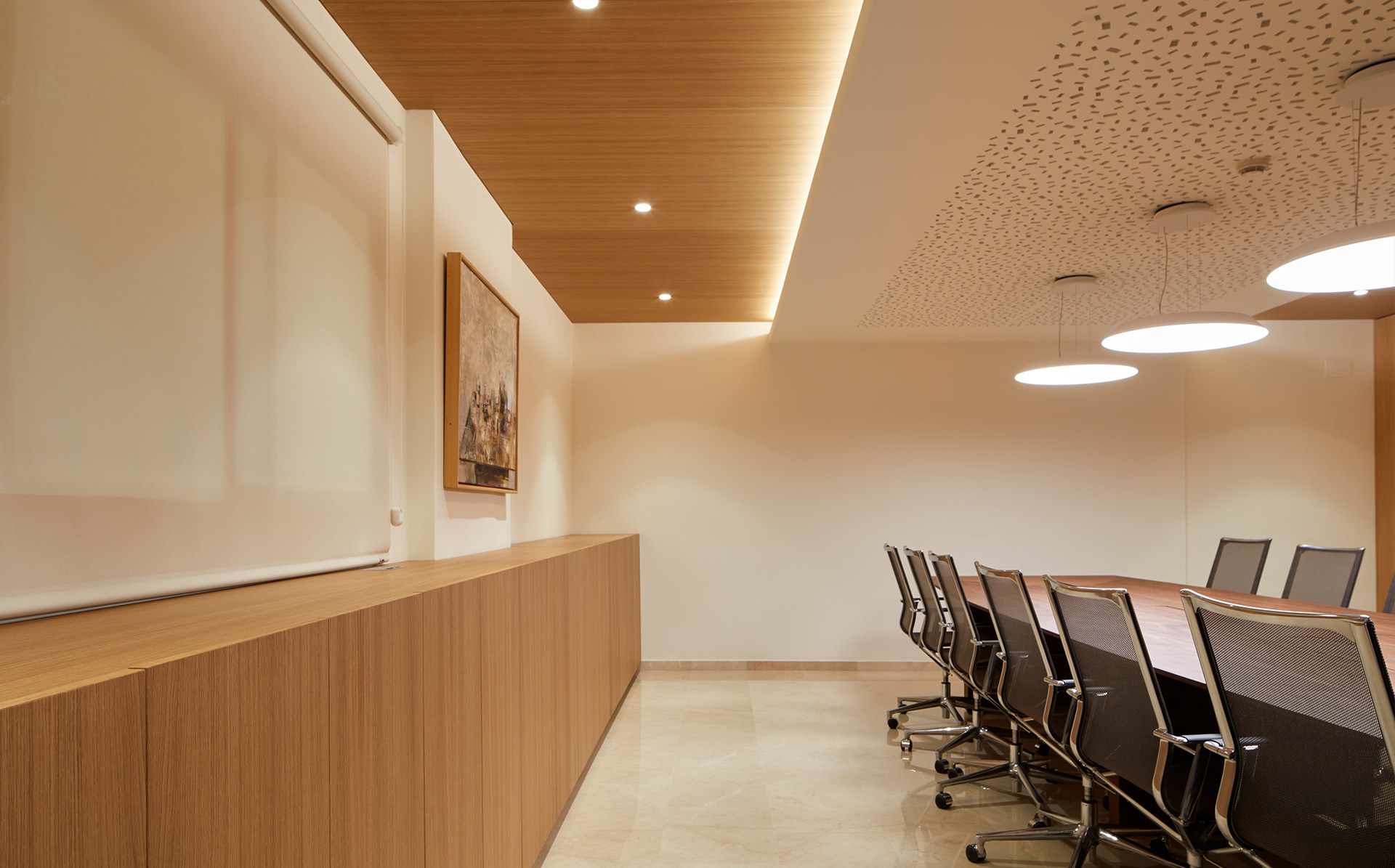 Mención especial merecen las zonas de reunión y los despachos de dirección, cuya función es la atención personalizada a clientes o las reuniones entre directivos.