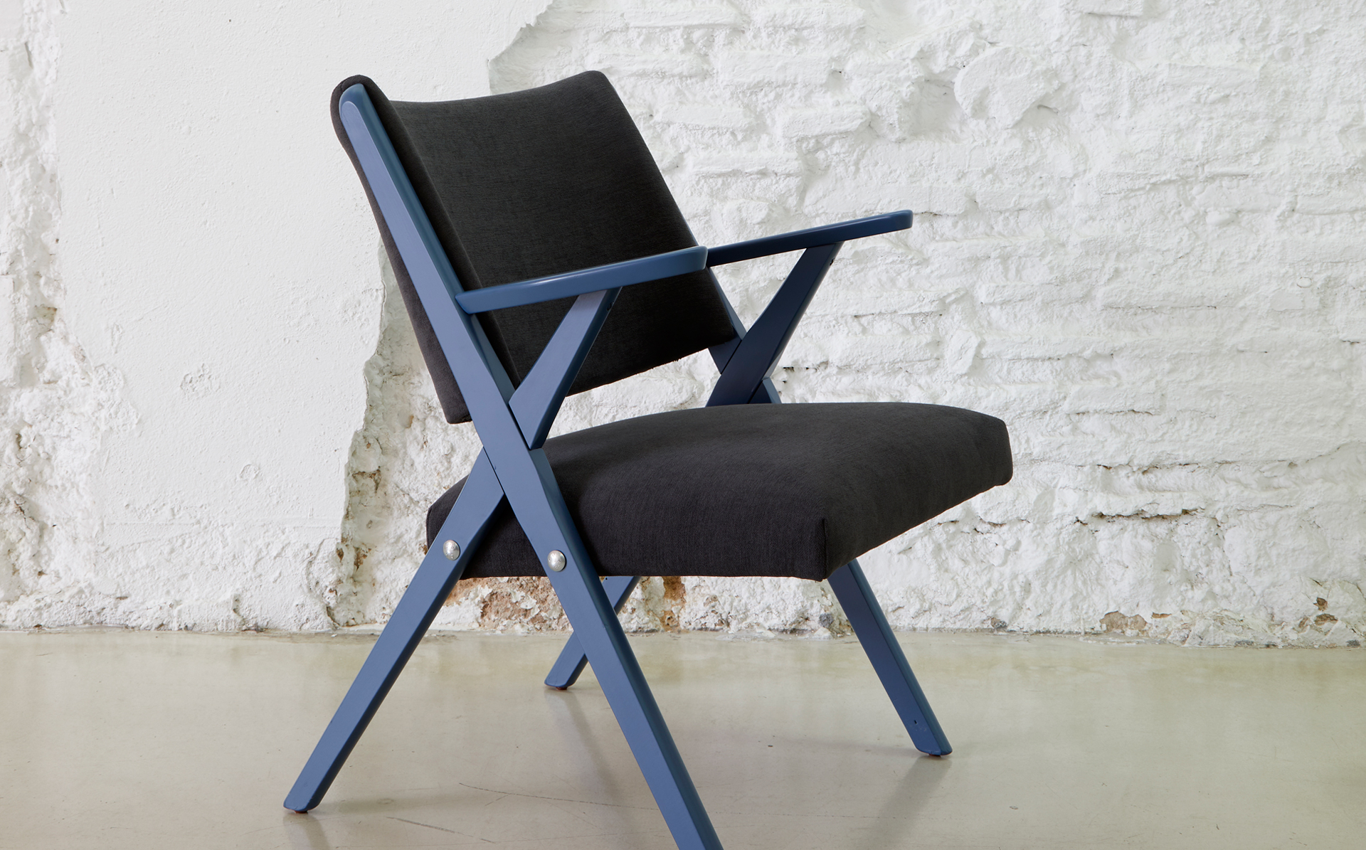 Butaca descalzadora con estructura en cruz de madera lacada. Asiento y respaldo tapizados.