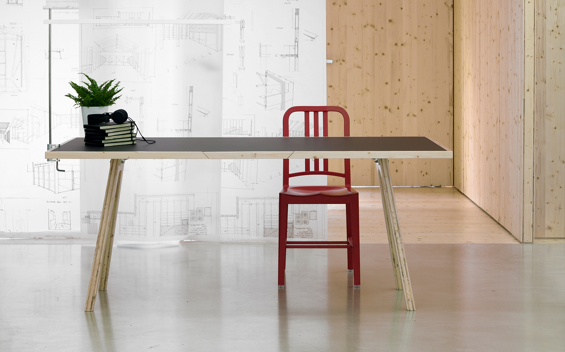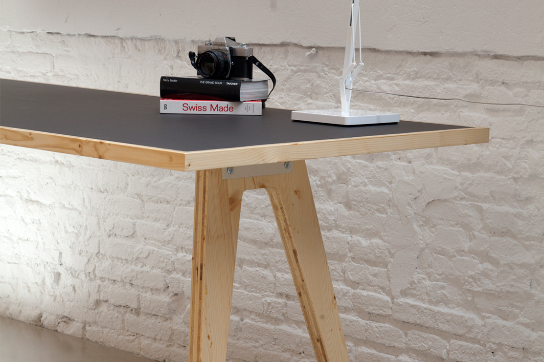 Mesa realizada en tablero tricapa de abeto. Sobre acabado en linóleo negro con pequeño cajón.