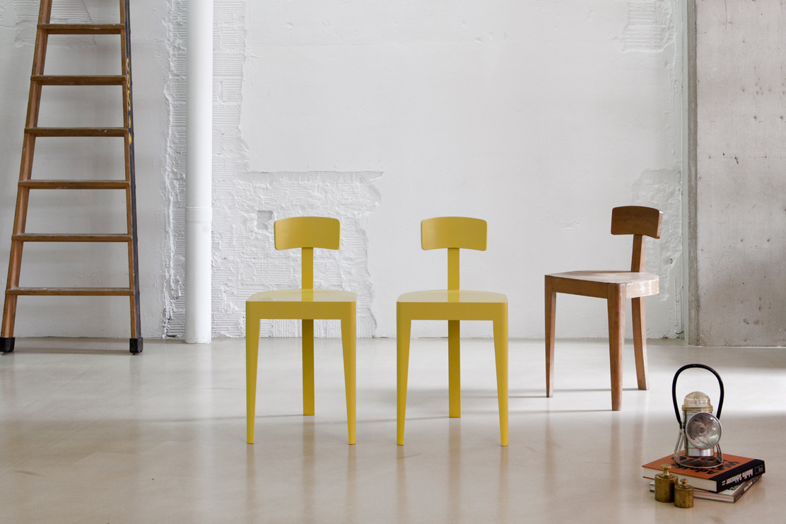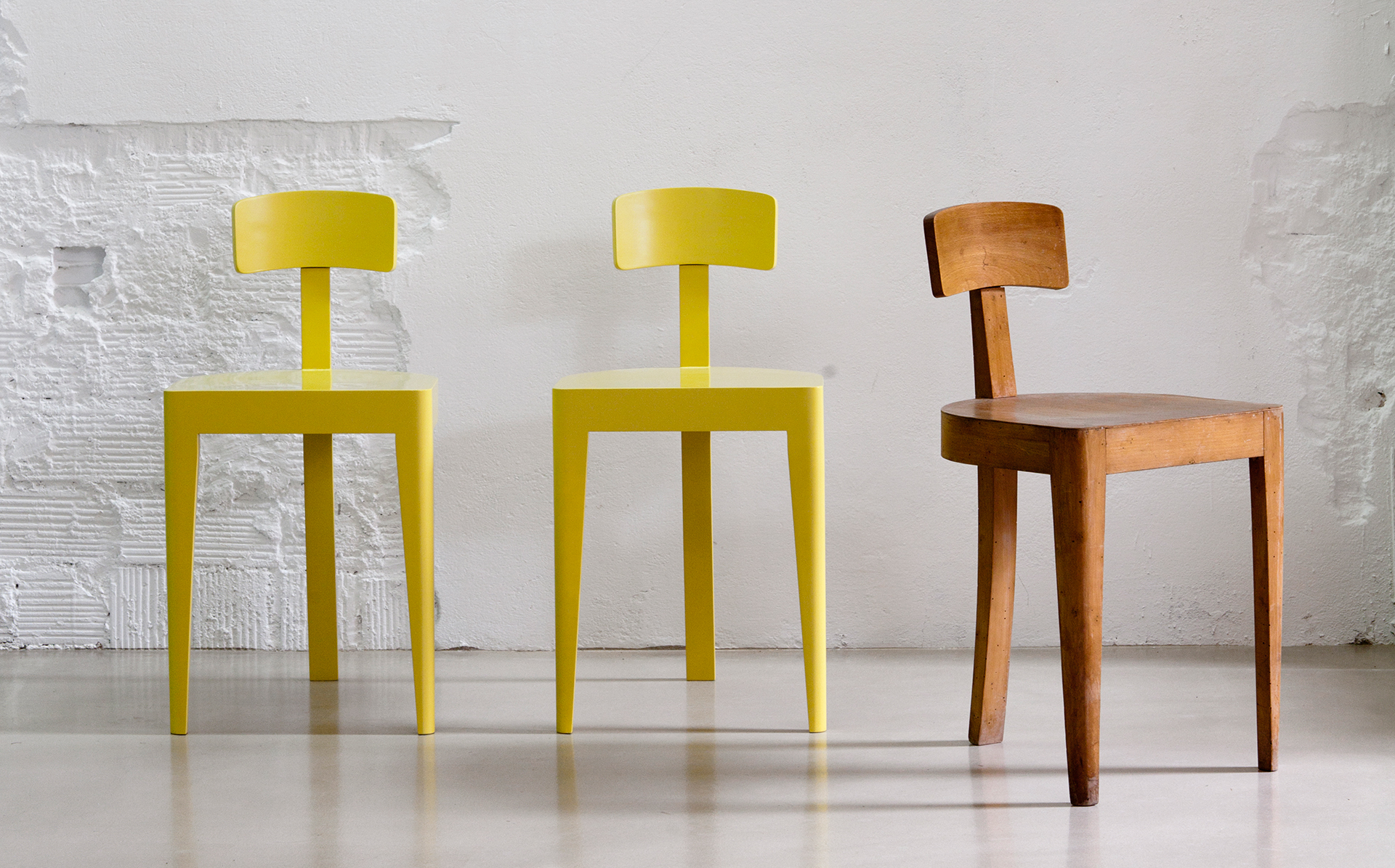 Silla de tres patas en madera de haya maciza. La pata trasera se prolonga para formar el respaldo. Acabado natural o lacado.