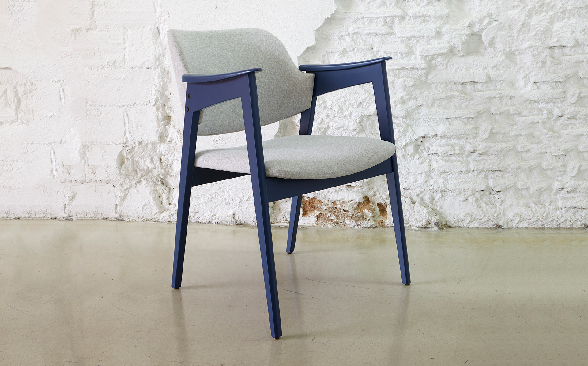 Silla con estructura de madera lacada. Asiento y respaldo tapizados. Se ofrece en dos sentadas diferentes, como silla y como butaca.