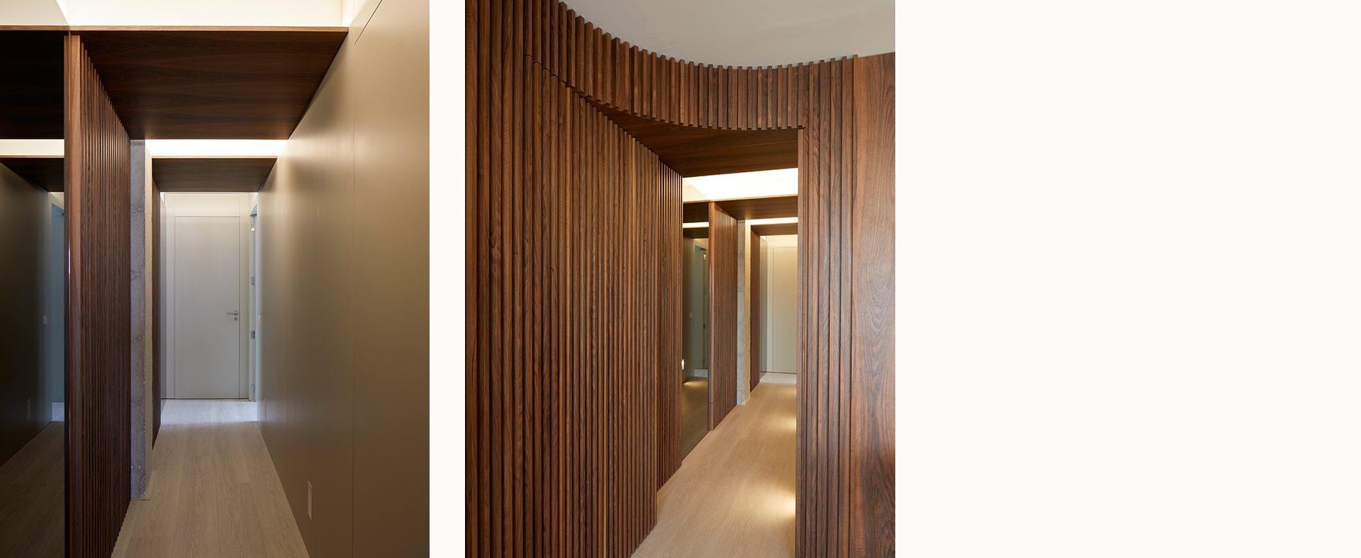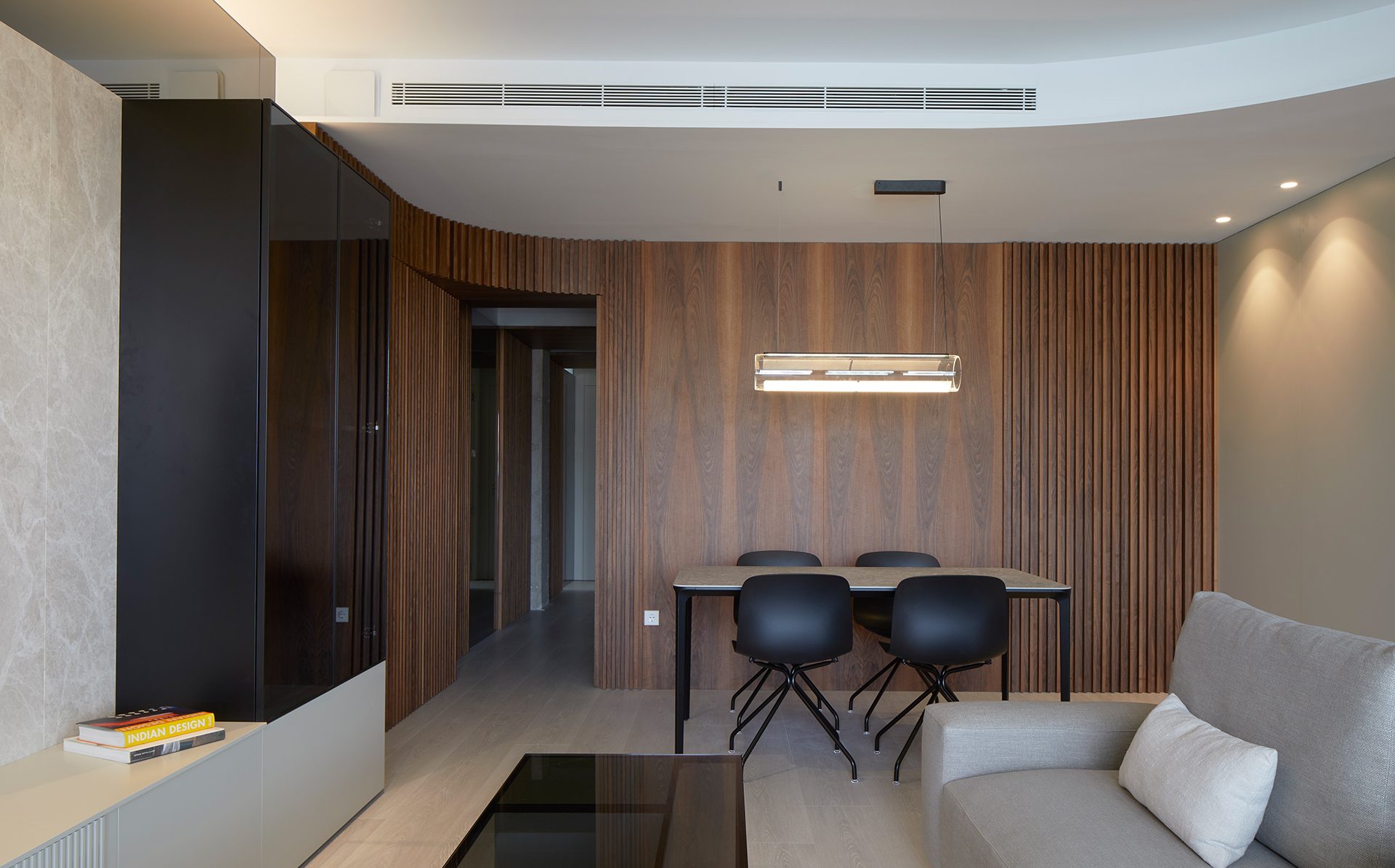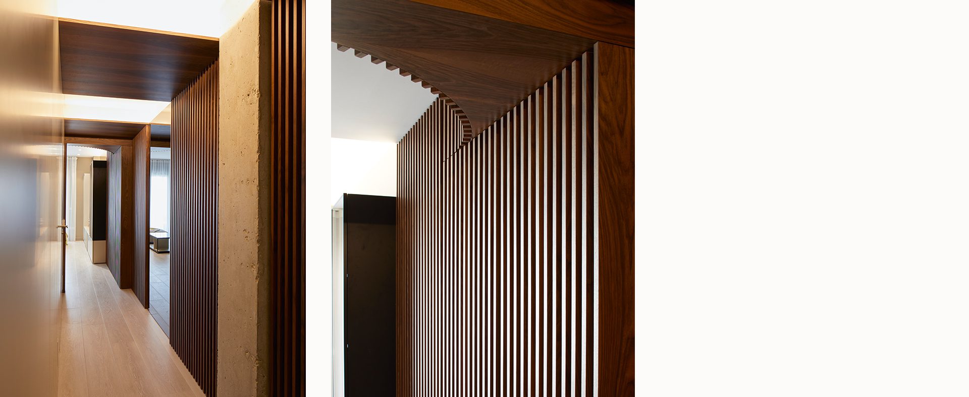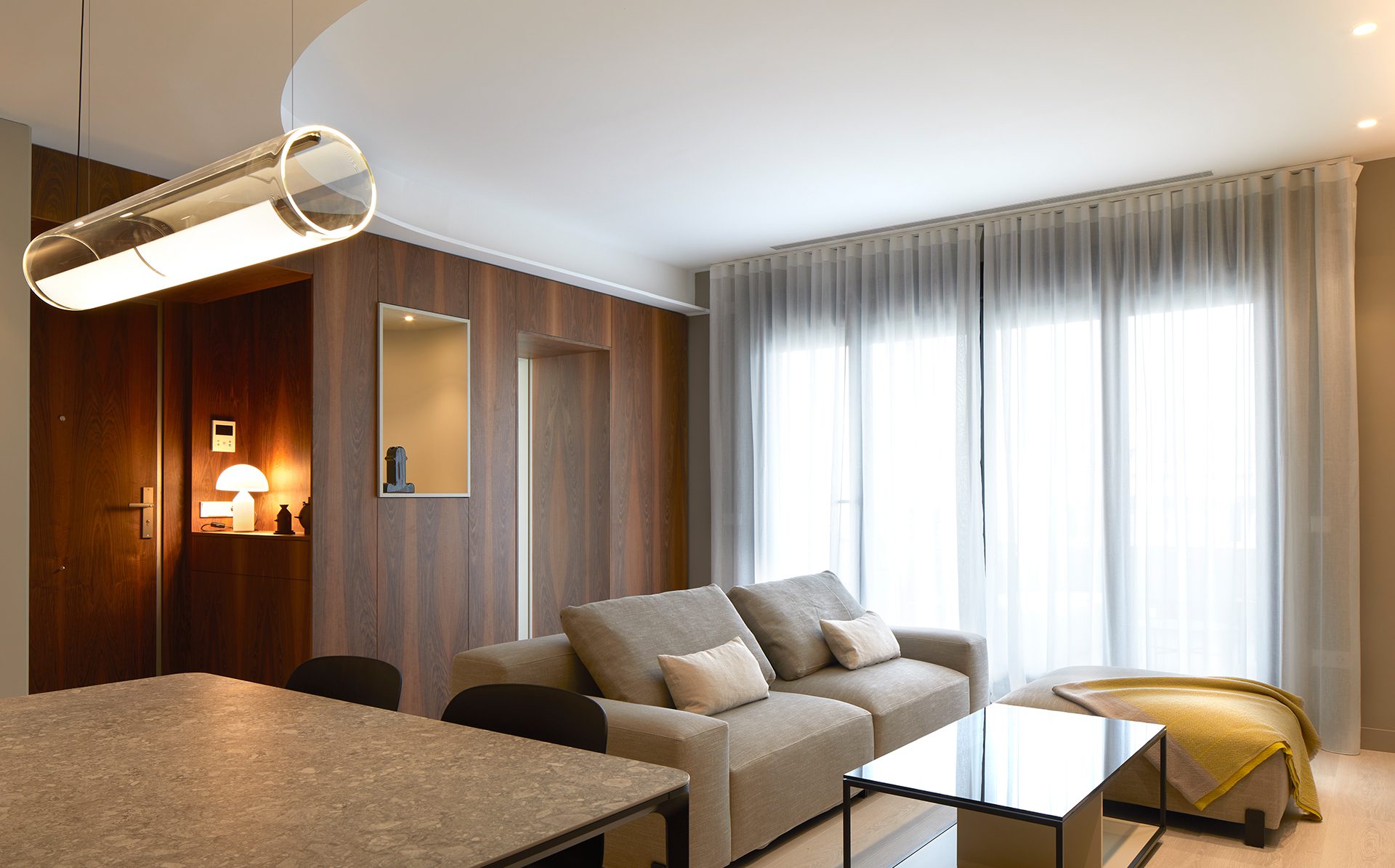 El pasillo que une la zona de día con la zona más privada de la vivienda se trabaja mediante el juego del techo a dos alturas diferentes y con el uso de materiales como la madera nogal y los espejos, que rompen con la línea longitudinal del espacio.