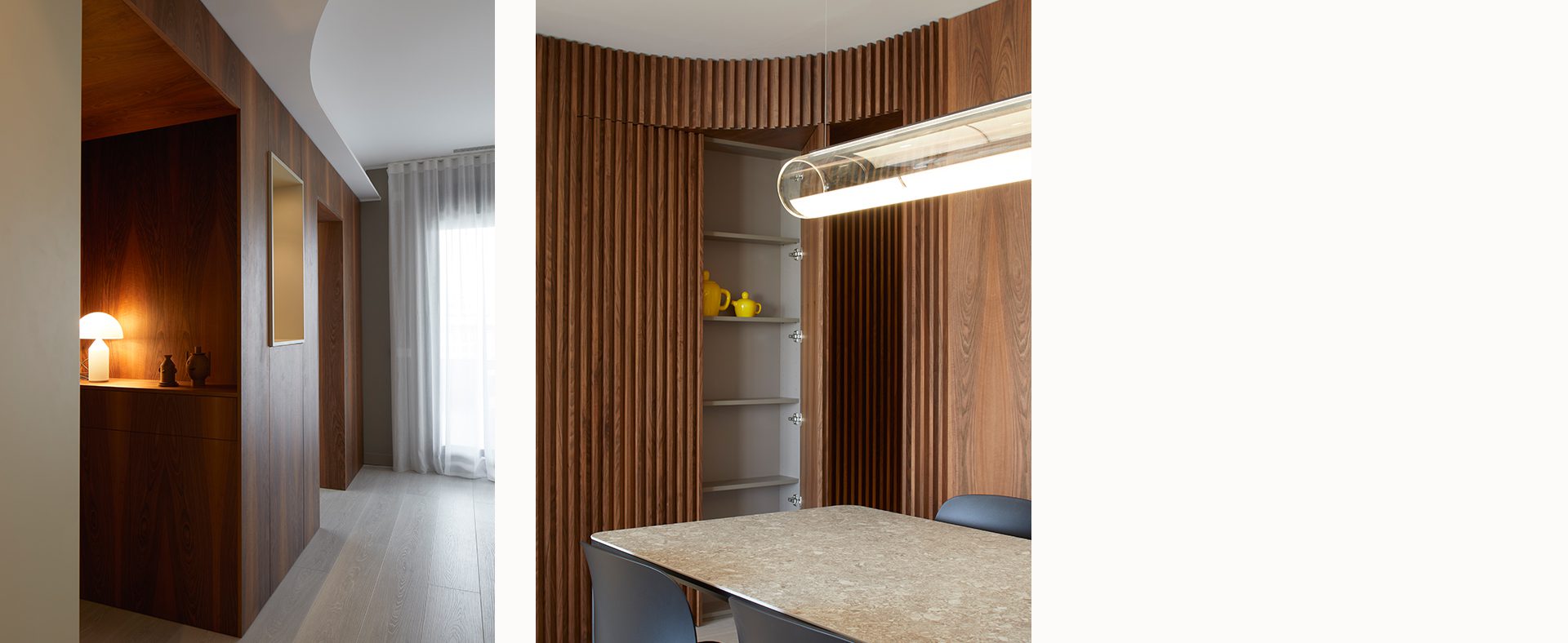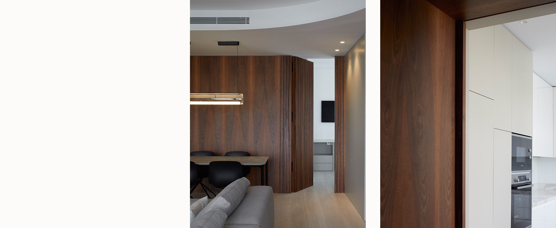 El acceso a la casa se realiza directamente desde la zona de día, atravesando una piel de nogal que recorre todo el espacio. Esta envolvente genera diferentes zonas de almacenaje, que dan servicio a comedor y cocina, a la vez que oculta el acceso a uno de los dormitorios. Las diferentes texturas de la madera y el lacado, junto a la piedra natural presente en el mueble del salón, consiguen crear un espacio acogedor e íntimo.