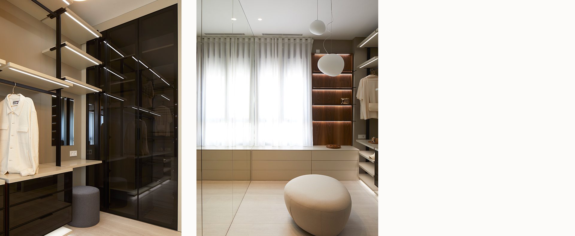 En el vestidor se proyecta el mobiliario a medida en madera, DM lacado y vidrio ahumado, unido al paramento vertical forrado de espejo.