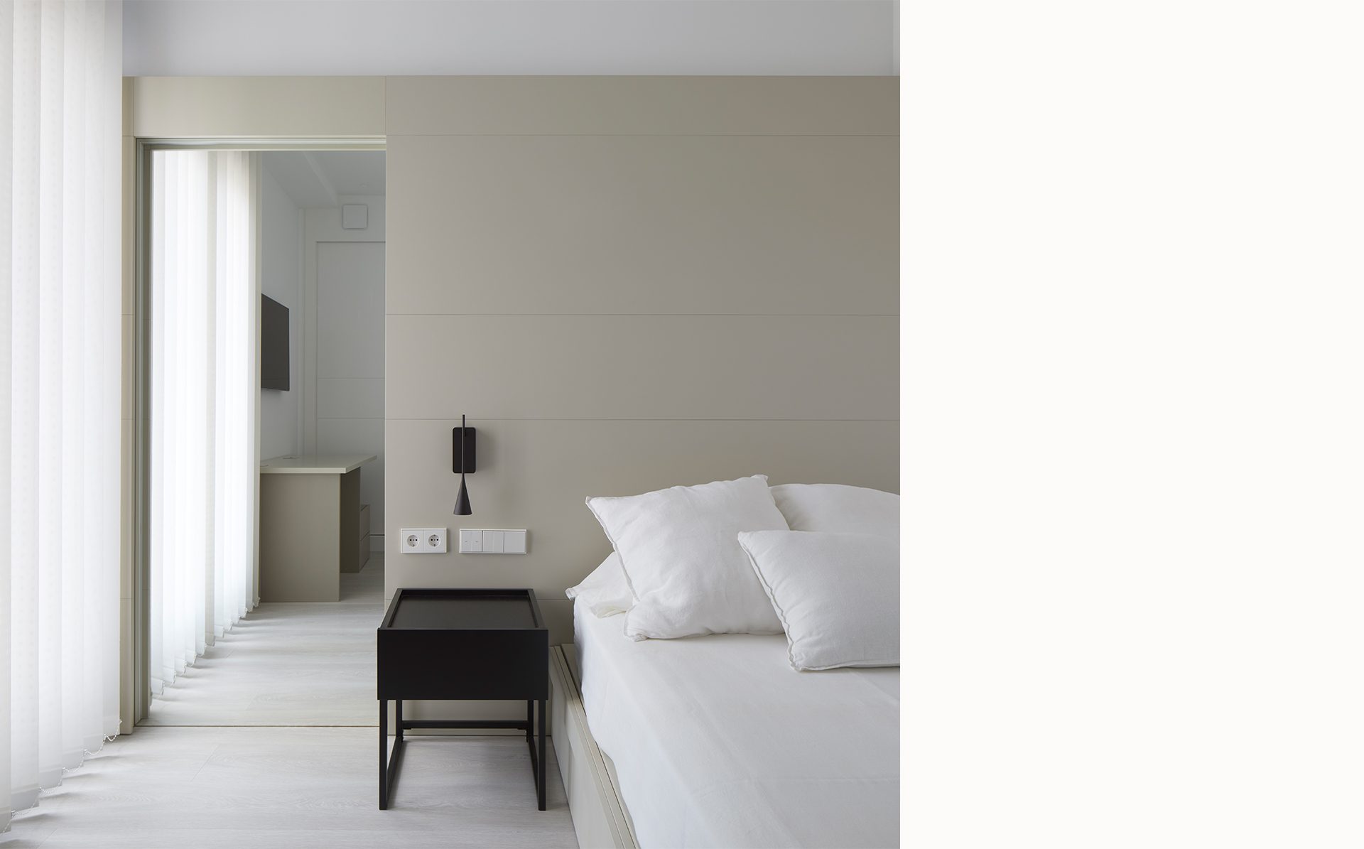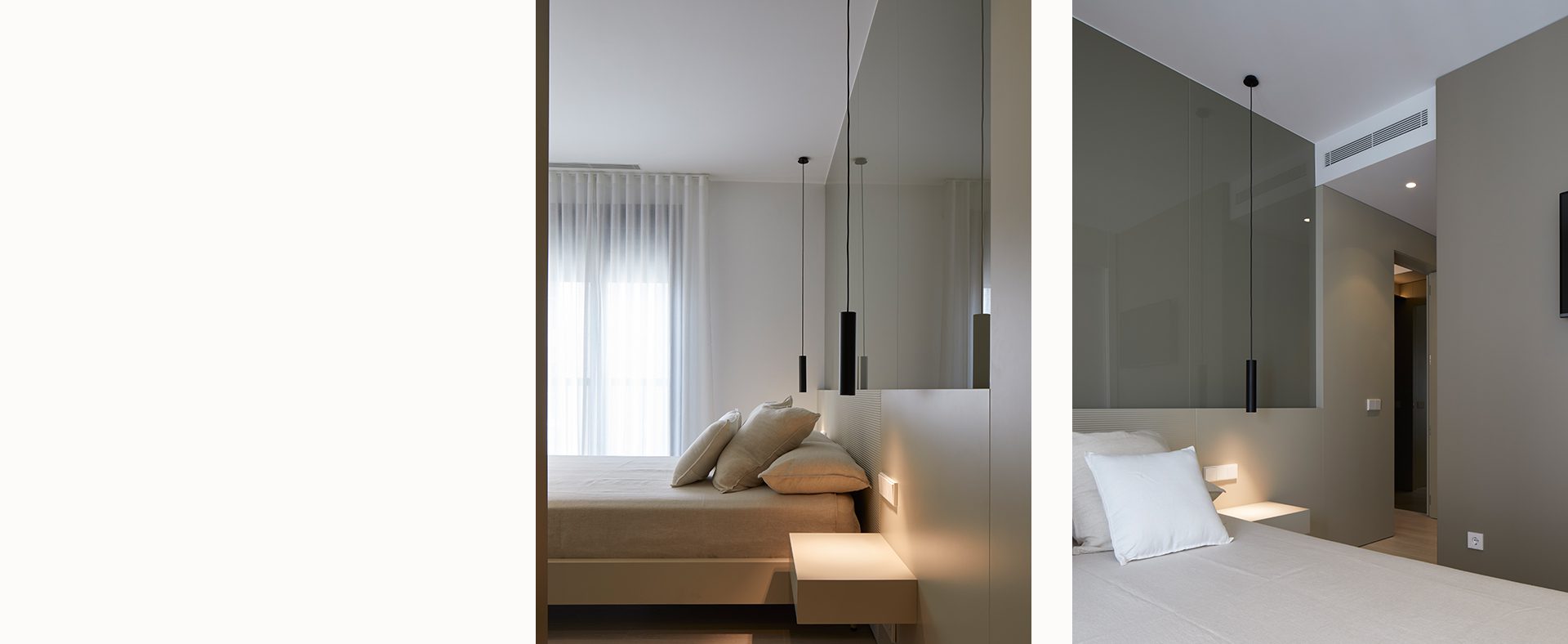 En los dormitorios se apuesta por DM lacados en diferentes tonos neutros y con formas sencillas y estudiadas, creando un mobiliario a medida que nos permite aprovechar al máximo las reducidas dimensiones de algunas estancias.