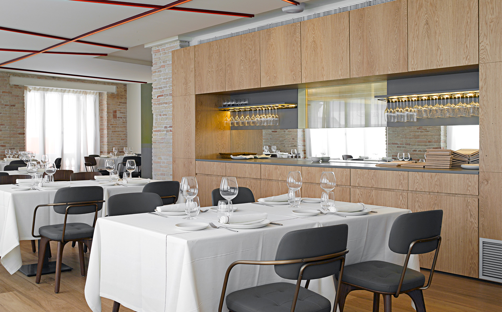 El pavimento general de madera de roble y el mueble de apoyo de camareros presiden todo este espacio, dominado por la luz natural de los grandes ventanales perimetrales de la pared de ladrillo visto.