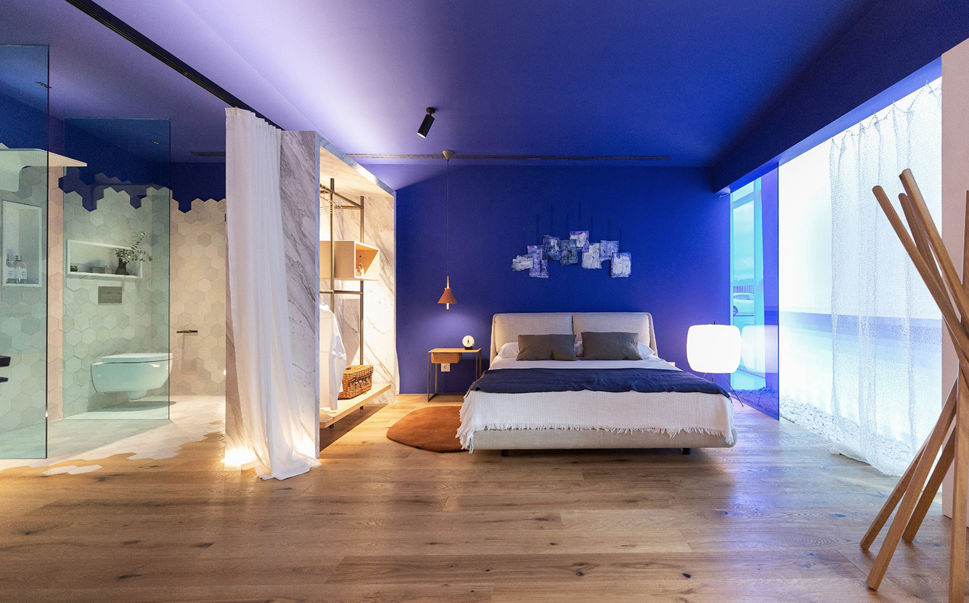En el interior, las estancias se ordenan a los lados de un pequeño patio con un olivo, abriéndose en su fachada interna hacia las vistas del horizonte marítimo recreadas con imágenes retroiluminadas y sonido de oleaje.