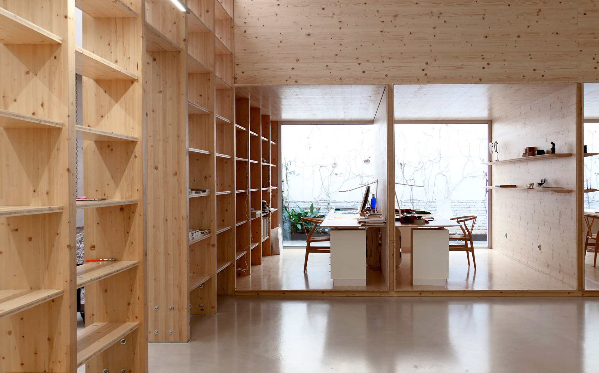 La gran armariada longitudinal que alberga los aseos, zona de reprografía y almacenaje de catálogos y muestras, está delimitada por unos portones pivotantes con bastidor de madera de abeto y policarbonato translúcido.